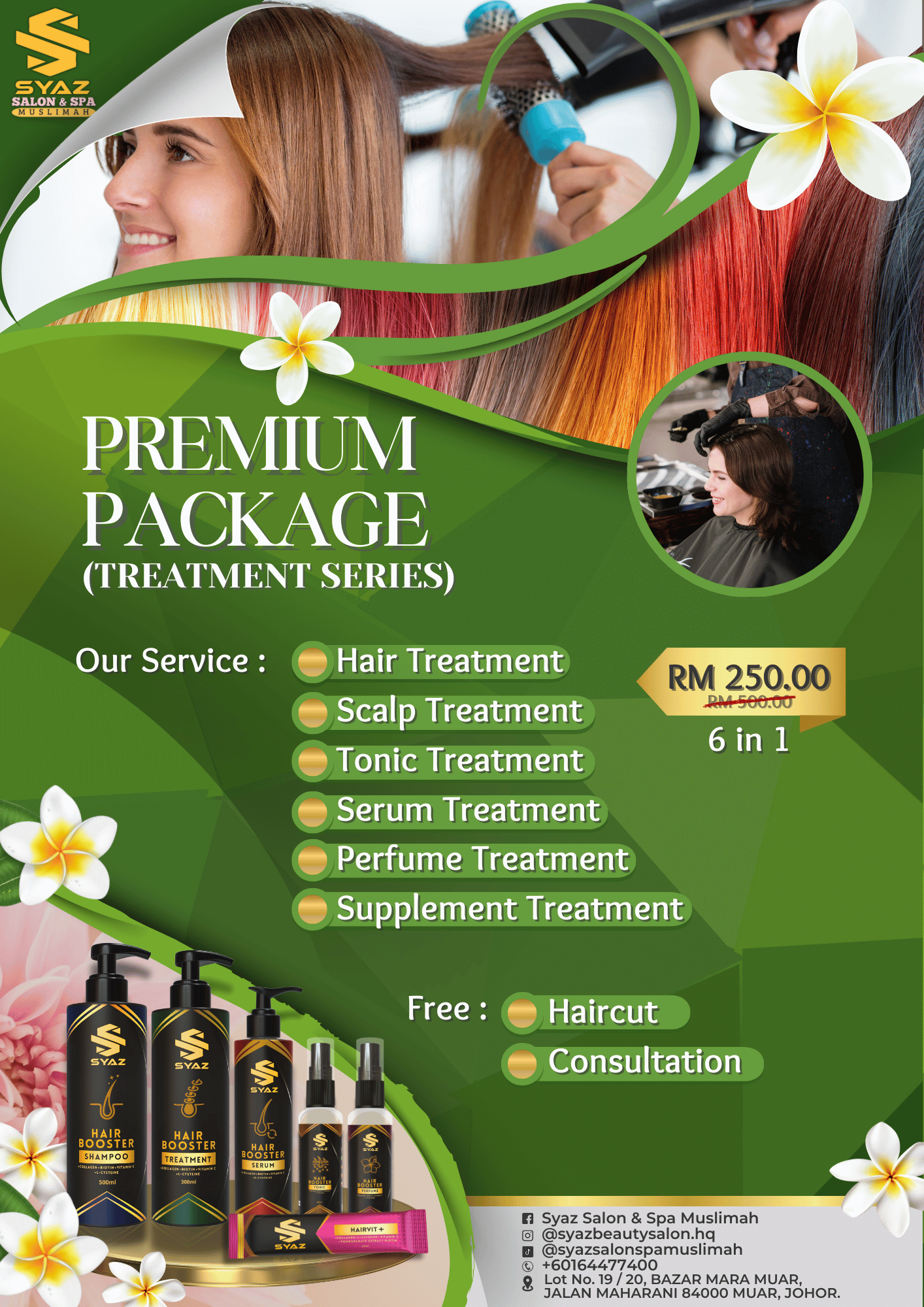 At Syaz Salon & Spa Muslimah, we provide expert hair treatments and styling to keep your hair healthy, shiny, and manageable. Whether tackling hair fall, dandruff, split ends, or just needing a fresh look, our treatments nourish, strengthen, and enhance your hair’s beauty.